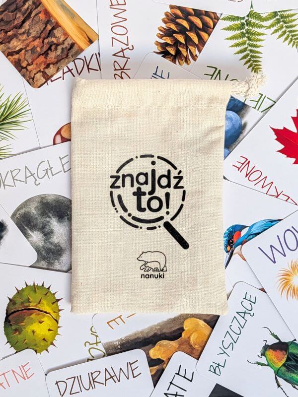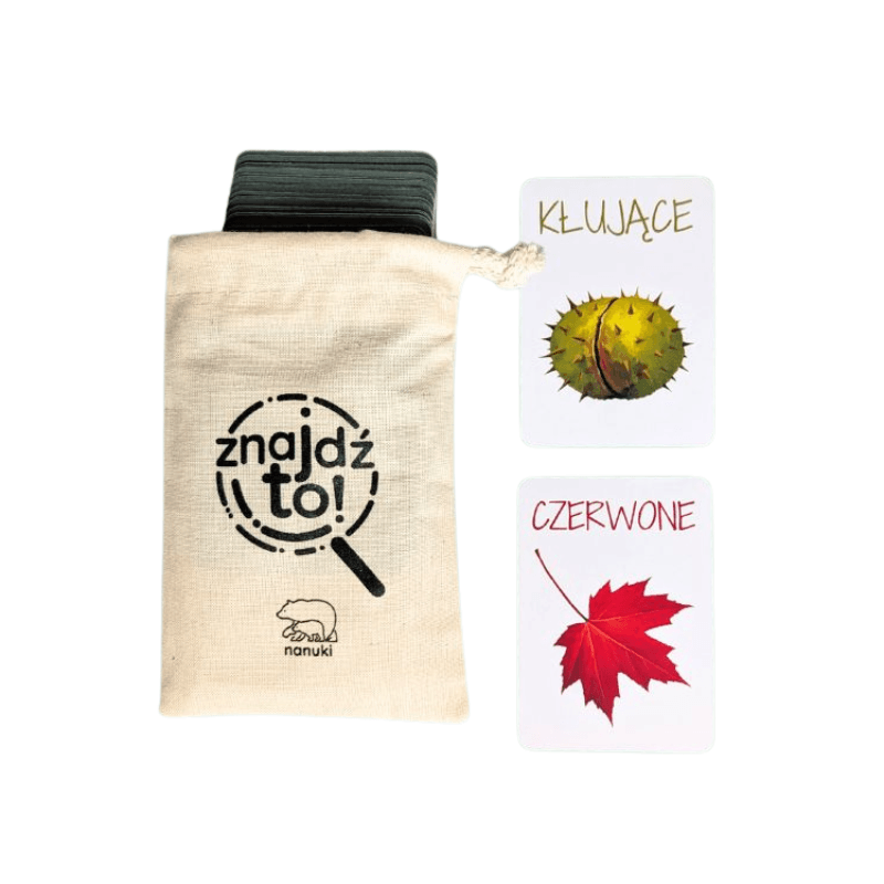 Znajdź to! od NANUKI to kompaktowa gra terenowa, którą zmieścisz w kieszonce plecaka i zabierzesz z łatwością na każdy spacer czy wyjazd. To 45 kart z cechami przedmiotów, które znajdziesz w swoim otoczeniu. Zanim pomyślisz: „brzmi prosto”, pomyśl jeszcze raz! W tej grze łatwo podniesiesz poziom trudności losując nie jedną, nie dwie, ale nawet trzy karty naraz!