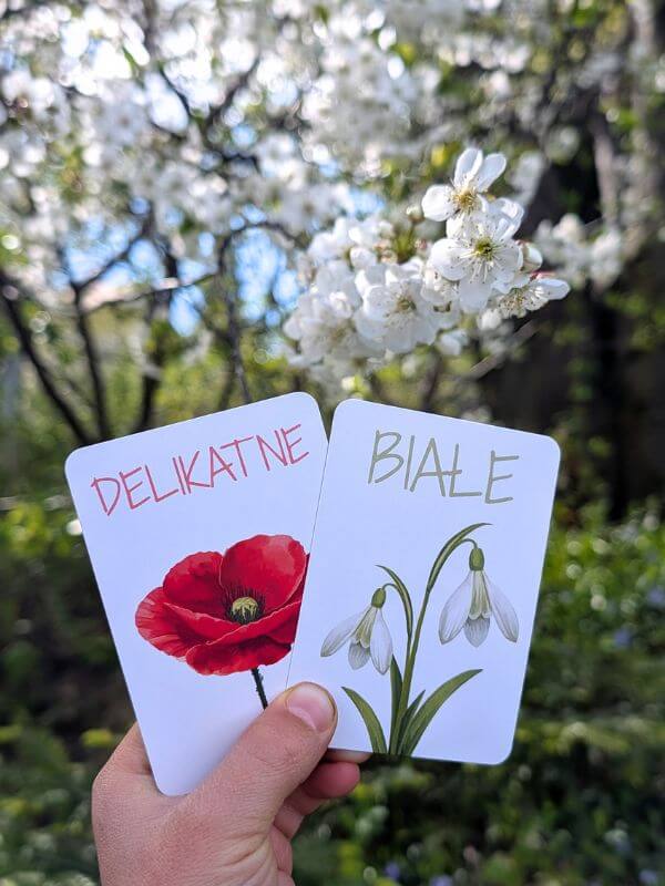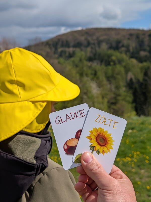 - Poziom I – dziecko losuje 1 kartę i szuka pasujących obiektów w swoim otoczeniu. Idealny dla młodszych dzieci, by nauczyć je podstaw obserwacji.