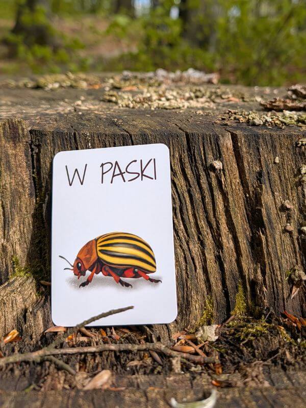- Poziom III – dziecko losuje 3 karty. To prawdziwe wyzwanie, które uczy analizy, syntezy i szybkiego kojarzenia faktów – tylko dla prawdziwych mistrzów tropienia!