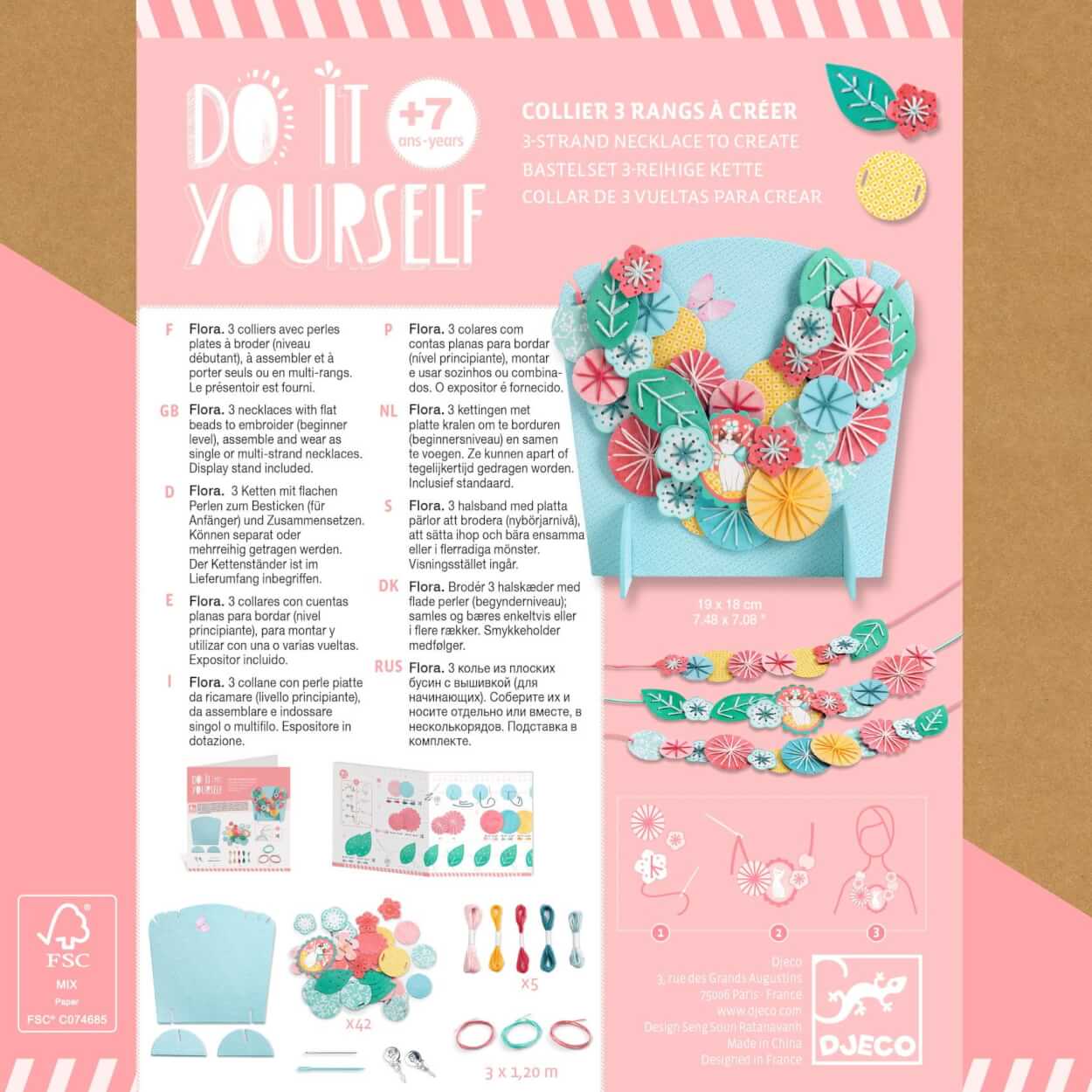 Na wstępnie dziurkowanych koralikach zastosowano haft płaski, aby ułatwić przejście igły. Po wyhaftowaniu po prostu przymocuj płaskie gumki z tyłu koralików, aby je połączyć, tworząc 3 naszyjniki, które możesz nosić osobno lub łączyć ze sobą za pomocą dołączonego zapięcia. Zestaw wprowadza dzieci w sztukę haftowania. Załączony stojak pozwala przechowywać bezpiecznie stworzoną biżuterię. Elementy zestawu wykonane są z papieru i kartonu posiadającego certyfikat FSC®